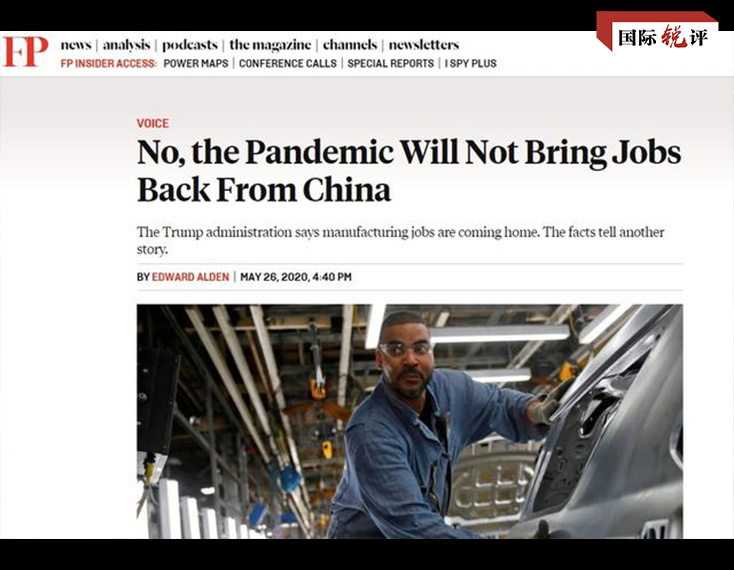 美国《外交政策》杂志网站也发文称,美国官员认为冠状病毒大流行将“把工作机会带回美国”只是一厢情愿的想法,没有任何证据表明有公司因疫情而急于将业务迁回美国。