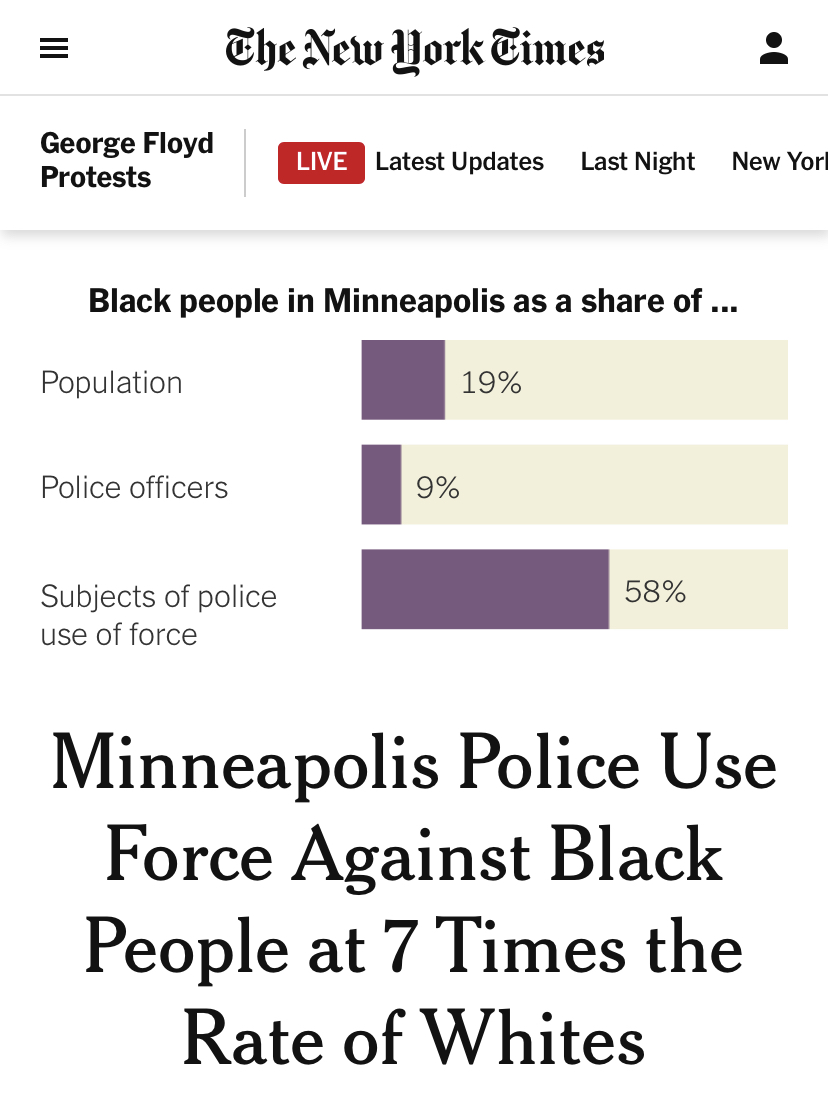 △《纽约时报》报道,明尼阿波利斯市警方对非裔使用武力是对白人的7倍