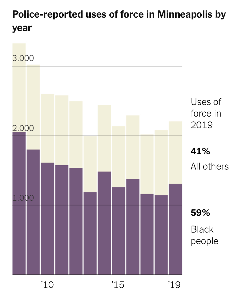 据《纽约时报》报道,在非裔人口不到20%的明尼阿波利斯市,当地警方使用武力的对象60%均为非裔。2015年以来,明尼阿波利斯警方记录了11500次警方使用武力案件,其中至少6650次的武力施加对象为非裔。与此相比,占明尼阿波利斯市总人口约60%的白人,只经历了其中的2750次。