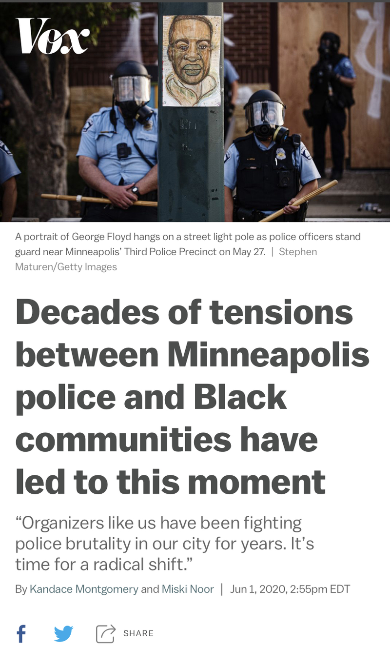 △Vox报道,多年来,明尼阿波利斯警方与非裔社区间的紧张关系导致了弗洛伊德惨剧的发生