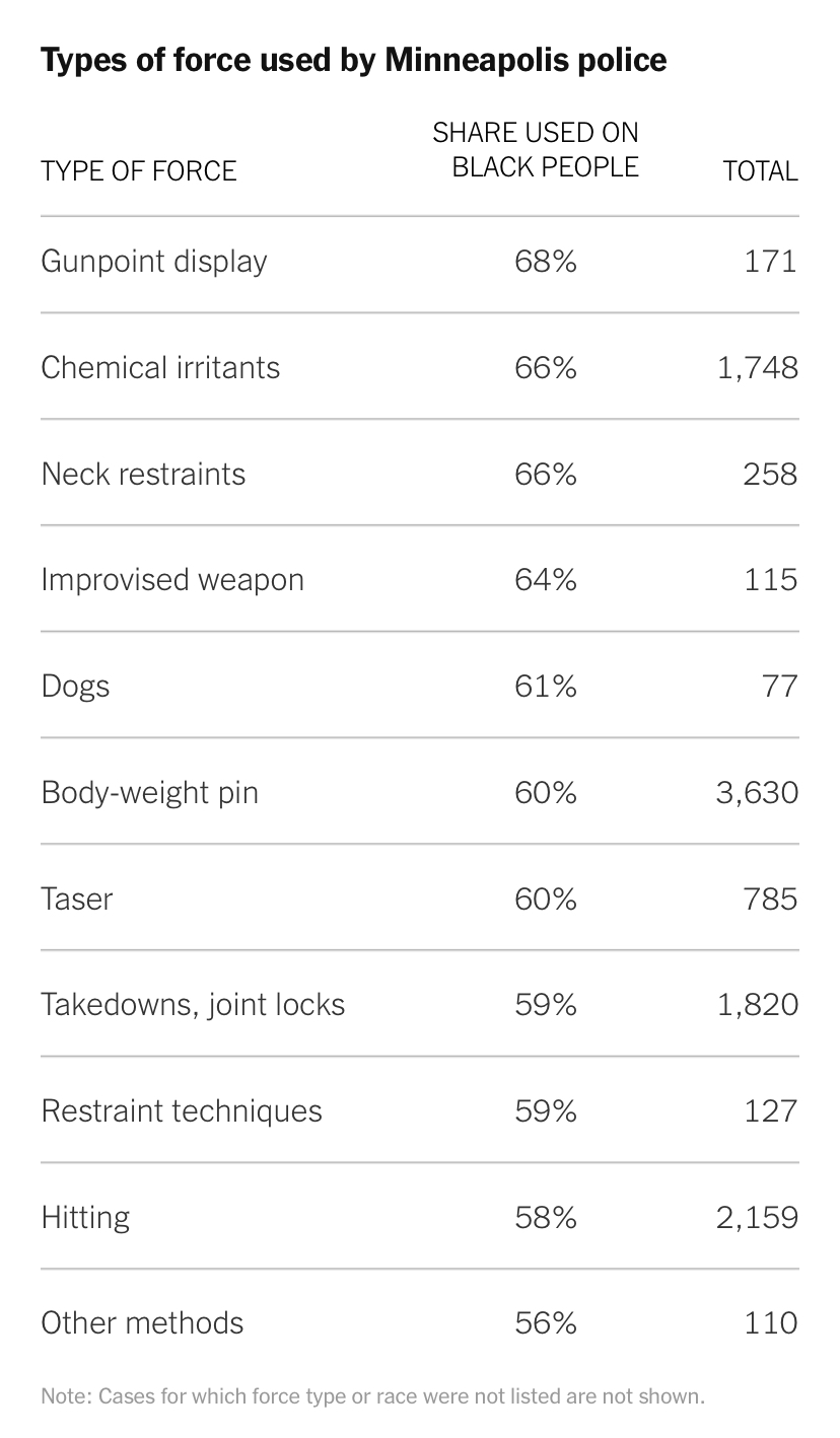 △《纽约时报》报道,在明尼阿波利斯,被警察实施武力的对象近60%为非裔