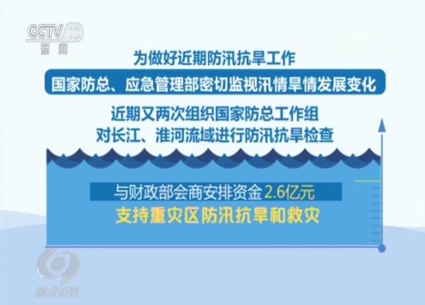 为做好近期防汛抗旱工作,国家防总、应急管理部密切监视汛情旱情发展变化,多次组织水利、气象等部门联合会商。近期又两次组织国家防总工作组对长江、淮河流域进行防汛抗旱检查,两次启动防汛防台风Ⅳ级应急响应;派出3个应急工作组赴重灾区协助和指导;与财政部会商安排资金2.6亿元支持重灾区防汛抗旱和救灾。