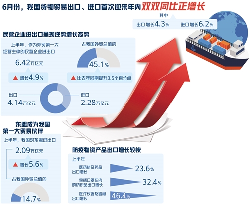 “我国在全球范围内率先控制住了疫情,率先实现了全面复工复产,对进出口形成了有力支撑。”李魁文举例道,上半年我国机电产品进口值增长1.2%,其中电子元件、自动数据处理设备及其零部件进口分别增长14.1%和7.2%,大宗商品如原油、煤炭、铁矿砂、铜矿砂进口量分别增长9.9%、12.7%、9.6%和3%。