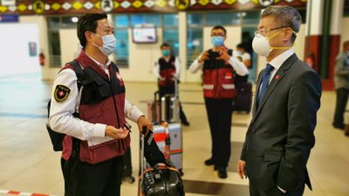 当地时间9月5日,中国抗疫医疗专家组圆满结束在几内亚工作,乘包机离开科纳克里启程回国。驻几大使黄巍和几政府官员等前往机场送行。