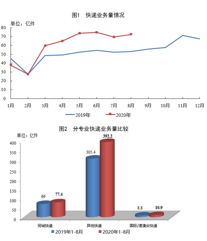 1-8月,全国快递服务企业业务量累计完成480.5亿件,同比增长25.4%;业务收入累计完成5274.5亿元,同比增长14.1%。其中,同城业务量累计完成77.4亿件,同比增长12.3%;异地业务量累计完成392.2亿件,同比增长28.4%;国际/港澳台业务量累计完成10.9亿件,同比增长24.5%。
