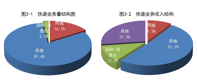 1-8月,同城、异地、国际/港澳台快递业务量分别占全部快递业务量的16.1%、81.6%和2.3%;业务收入分别占全部快递收入的9.3%、51.2%和12.2%。与去年同期相比,同城快递业务量的比重下降1.9个百分点,异地快递业务量的比重上升1.9个百分点,国际/港澳台业务量比重基本持平。