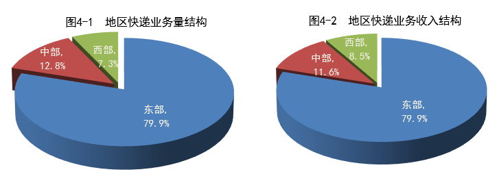 1-8月,东、中、西部地区快递业务量比重分别为79.9%、12.8%和7.3%,业务收入比重分别为79.9%、11.6%和8.5%。与去年同期相比,东部地区快递业务量比重下降0.1个百分点,快递业务收入比重下降0.6个百分点;中部地区快递业务量比重上升0.2个百分点,快递业务收入比重上升0.5个百分点;西部地区快递业务量比重下降0.1个百分点,快递业务收入比重上升0.1个百分点。