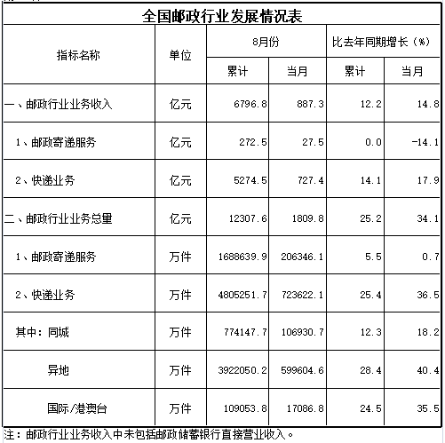8月份,全行业业务收入完成887.3亿元,同比增长14.8%;业务总量完成1809.8亿元,同比增长34.1%。