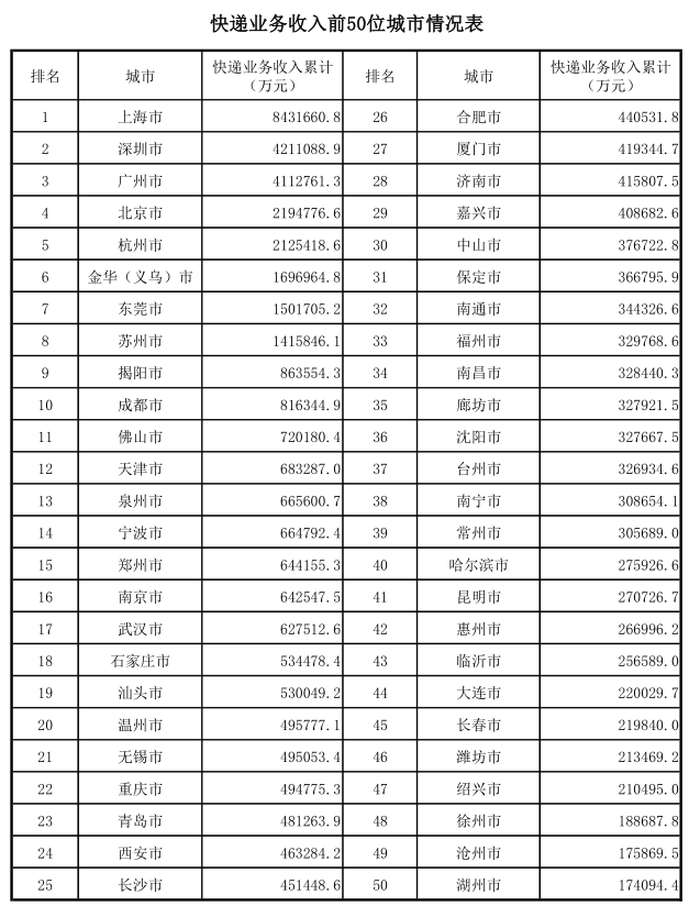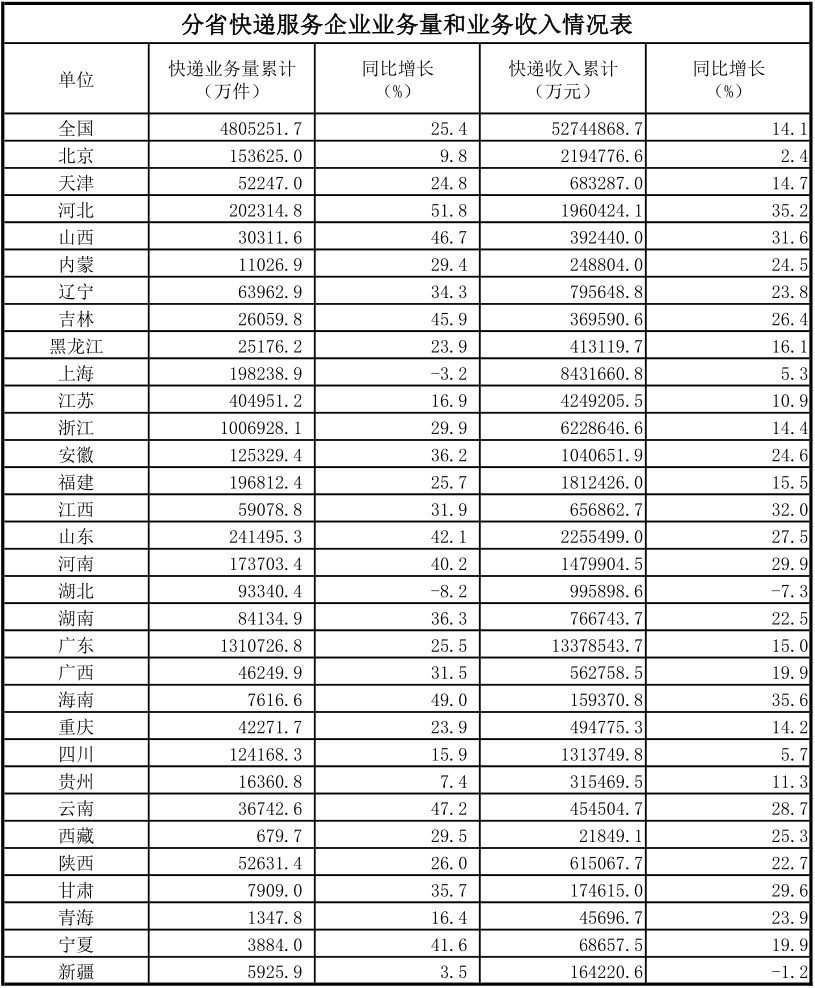 8月份,邮政服务业务总量完成210.7亿元,同比增长8.5%;邮政寄递服务业务量完成20.6亿件,同比增长0.7%;邮政寄递服务业务收入完成27.5亿元,同比下降14.1%。