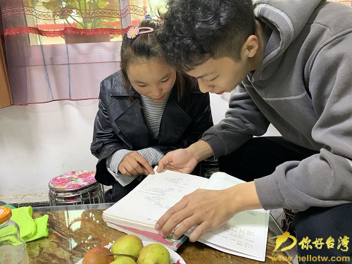 台青谢建鋐与农户家正在读初二的小姑娘许下了“四年之约”,图为他在认真查看小姑娘的课堂笔记