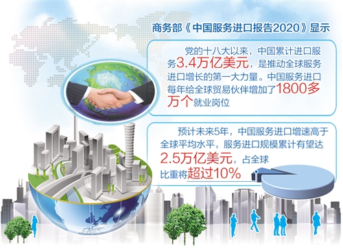 商务部6日在第三届进博会上发布《中国服务进口报告2020》显示,中国服务进口既满足自身需要又惠及全球。党的十八大以来,中国累计进口服务3.4万亿美元,是推动全球服务进口增长的第一大力量。中国服务进口每年给全球贸易伙伴增加了1800多万个就业岗位,为全球产业链供应链提供了广阔而稳定的市场。
