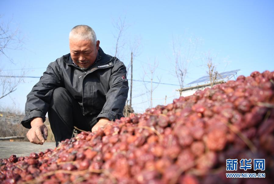 河北省阜平县东城铺村建档立卡贫困户刘国旗在家中挑拣晾晒的大枣(11月25日摄)。新华社记者 朱旭东 摄