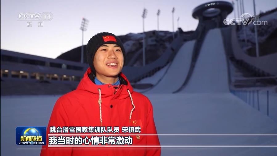 跳台滑雪国家集训队队员 宋祺武:我当时的心情非常激动,因为我们滑下来之后在停止区离他只有20多米的距离,那是我离他最近的时候。我们一定不忘初心,牢记使命,每天刻苦地训练。在雪如意这片场地上实现我们的梦想。