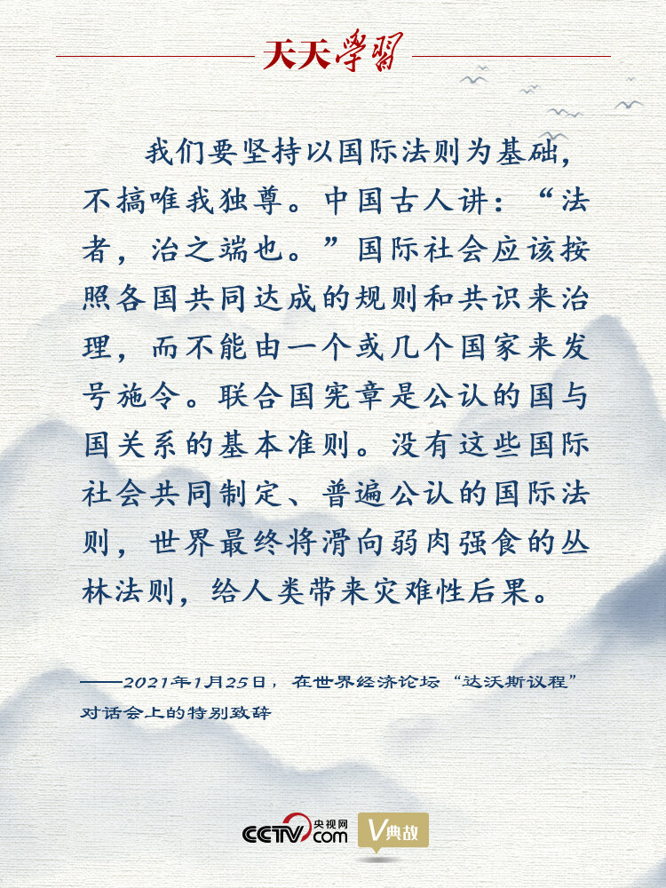 在致辞中,习近平主席强调要厉行国际法治,毫不动摇维护以联合国为核心的国际体系、以国际法为基础的国际秩序。他引用“法者,治之端也”这句古语,指出要坚持通过制度和规则来协调规范各国关系,反对恃强凌弱,不能谁胳膊粗、拳头大谁说了算,也不能以多边主义之名、行单边主义之实,为完善全球治理体系发出中国声音、提出中国方案。