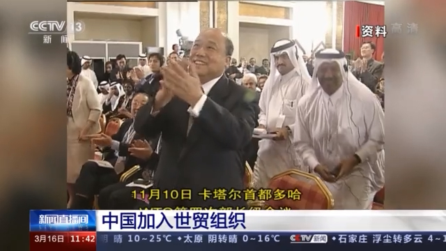 来看庆祝中国共产党成立100周年系列报道《奋斗百年路 启航新征程》。 2001年12月11日,历经15年谈判,中国正式加入世贸组织,成为第143个成员。中国加入世界贸易组织,是中国深度参与经济全球化的里程碑,标志着中国改革开放进入历史新阶段。加入世贸组织以来,中国积极践行自由贸易理念,全面履行加入承诺,大幅开放市场,实现更广互利共赢,在对外开放中展现了大国担当。