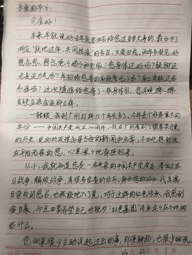 “从小,我就知道您是一位光荣的中国共产党党员,参加过抗日战争、解放战争,有很多宝贵的经历。身为您的孙女,我耳濡目染受到感召,也积极地入了党。对于这样的红色传承,我感到很自豪,而且由衷希望自己也能为‘红色基因’传承实实在在地做些什么。”