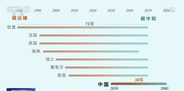 第三张图,指的是中国从“碳达峰”到“碳中和”所要经历的时间跨度。大部分发达国家都有50—70年的过渡期,中国却争取只用30年时间。