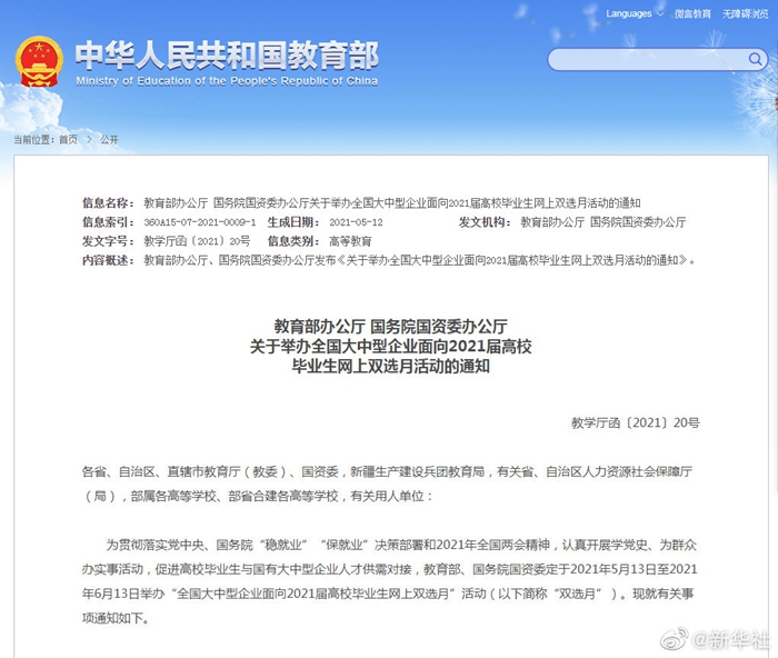 毕业生看过来!全国大中型企业面向2021届高校毕业生网上双选月活动举办