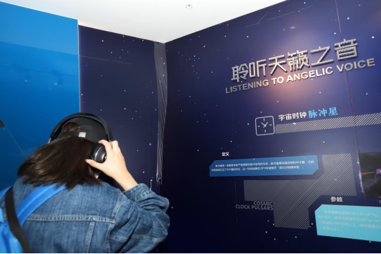 在平塘国际天文体验馆中,游客聆听脉冲星的声音