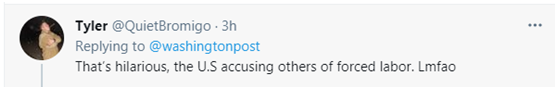 但不少网友对此不甚赞同。有网友感觉这颇为可笑, “那真是滑稽,美国指责其他人强迫劳动。笑死我了。”