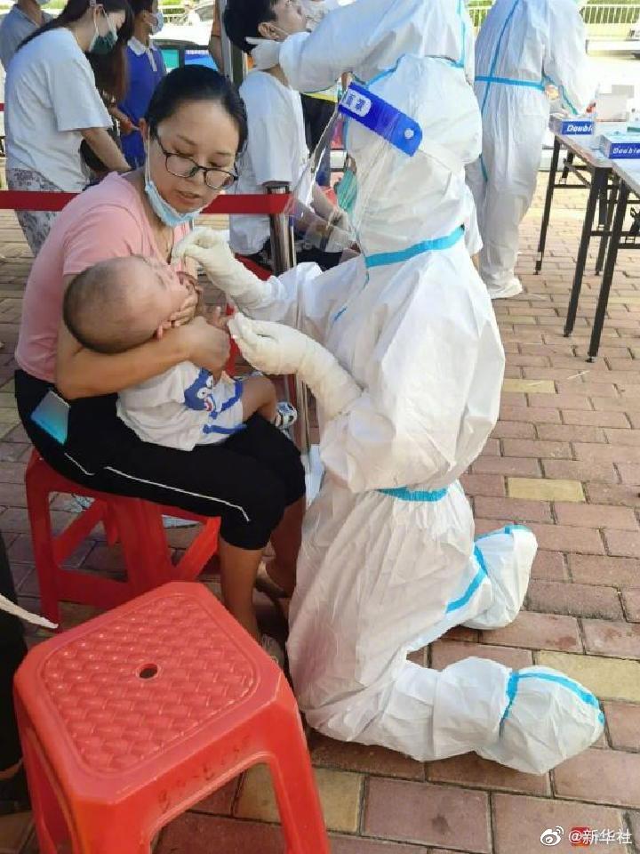 在广东多地启动的大规模核酸检测中,身着防护服的医务人员们不畏高温炎热,被人们亲切地称为“大白”。6月9日,东莞市虎门镇口腔科医生陈达峰在东方社区为行动不便的老人进行流动检测,为了让老人家舒服一点,他多次跪下来采集。6月7日,深圳市产科护士杨海萍为一名母亲怀抱中的孩子做核酸,她的姿势也是跪了下来。5月27日,广州市番禺区石楼镇社区卫生服务中心黎国伟在幼儿园采集咽拭子时,同样选择了跪下来以减少孩子们的呕吐反应。跪下来,降低了高度,增加了温度。“大白”们,谢谢你们,让老人孩子们被温柔以待。(记者 田建川)