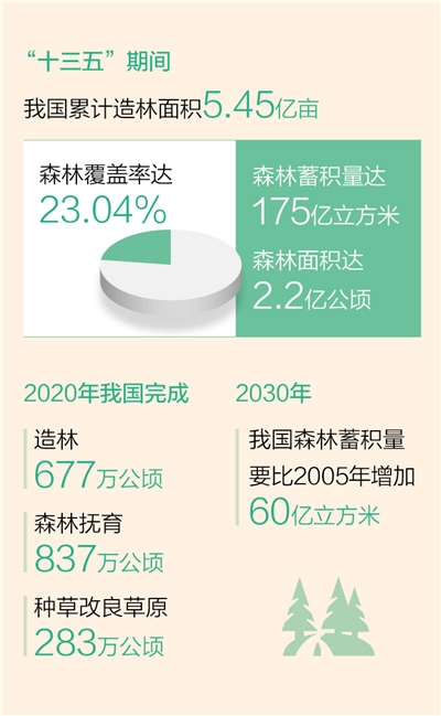 本报咸阳6月11日电 (记者高云才)记者从全国地方关注森林活动工作交流座谈会获悉:我国森林面积和森林蓄积量连续30年保持“双增长”。“十三五”期间,我国累计造林5.45亿亩,森林覆盖率达到23.04%,森林蓄积量达到175亿立方米,森林面积达到2.2亿公顷。