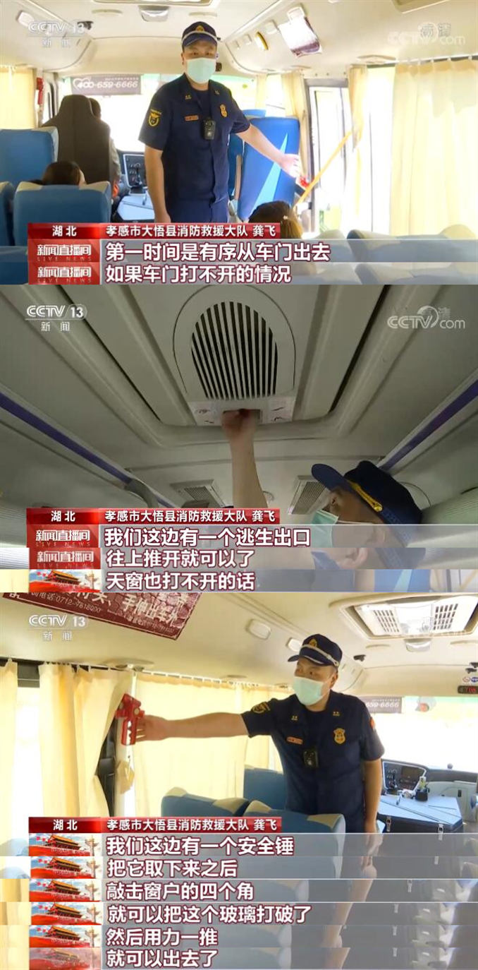 长途客车一旦发生火情或者其他紧急情况,车上的乘客应当如何正确逃生?湖北孝感的消防监督员在抽查长途客车车载消防设施配备的同时,为乘客进行了演示。