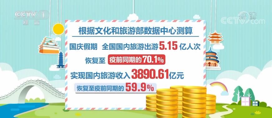这个假期,人们的出游热情被充分点燃。根据文化和旅游部数据中心测算,国庆假期,全国国内旅游出游5.15亿人次,按可比口径恢复至疫前同期的70.1%。实现国内旅游收入3890.61亿元,恢复至疫前同期的59.9%。