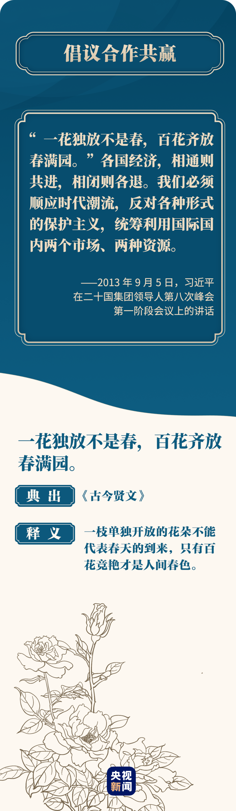 纵观习主席在历次G20峰会上的讲话,他多次引经据典向世界阐述中国的发展观,赋予传统文化新的时代内涵,为完善全球经济治理贡献中国智慧。让我们从那些经典中,领会习近平关于全球发展的深刻思考。