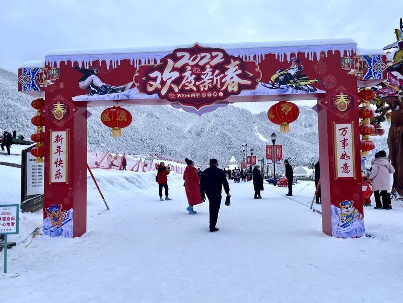 2022年春节假期冰雪运动游持续火爆,成都西岭雪山滑雪场的虎年新春布景。(图片来源:新华社)