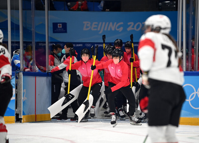 2月3日,冰球“雪童”在比赛间隙“冲进”赛场清扫冰面。(图片来源:新华社)