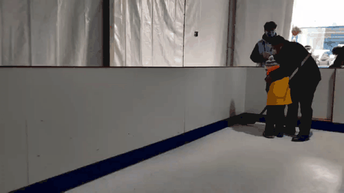 图为冰球体验区,男孩在家长的指导下体验冰球项目带来的快乐。中工网记者 刘云摄