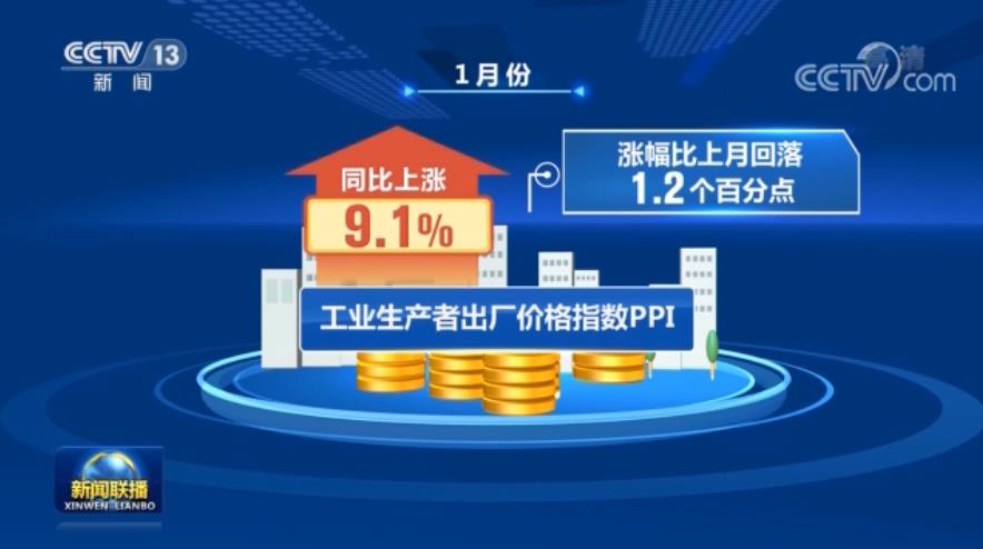 工业品价格方面,针对大宗商品价格上涨压力加大,国家有关部门采取供需双向调节、加强市场监管、做好预期管理等一系列措施。目前,2022年发电供热用煤中长期合同签订率已达到100%,煤炭、钢材等行业价格走低,也带动工业品价格整体回落。1月份,工业生产者出厂价格指数PPI同比上涨9.1%,涨幅比上月回落1.2个百分点。
