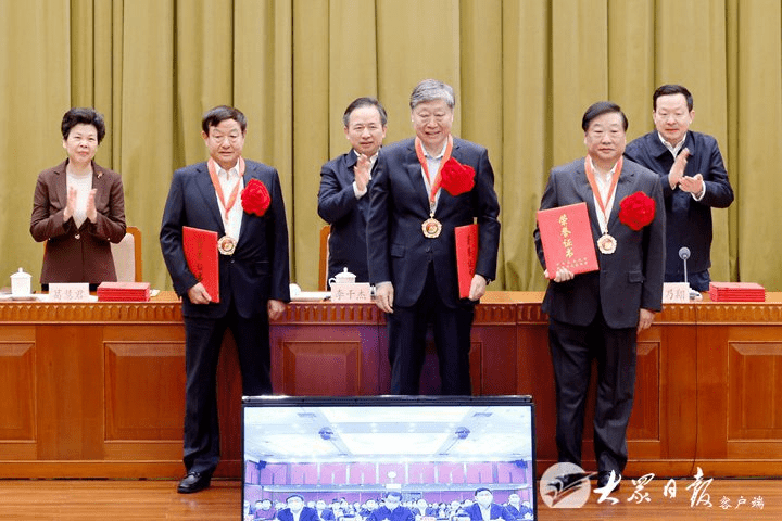 3名山东省杰出企业家,分别为海尔集团董事局名誉主席张瑞敏(图中),山东重工集团有限公司党委书记、董事长谭旭光(图右),威海威高国际医疗投资控股有限公司原董事局主席陈学利(图左)。