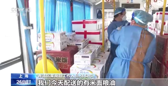 青浦区某商超工作人员 张良伟:我们今天配送的有米面粮油,还有一些新鲜蔬菜,一些调味品,像酱油、生抽、老抽,还有盐、味精,还有蚝油等商品。还有一些纸巾、抽纸、厕纸等。我们今天都是随着这个车我们一起发往居民地,我们基本上现在是每天都会往社区发送一次。