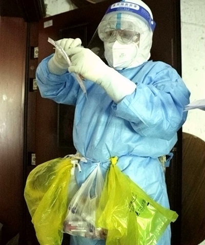 5月2日早上9点不到,刘彩丽来到小区门口,穿戴好防护服,腰上绑好采样工具包、消毒用具,进入封控区为居民进行核酸采样。小区是5层的老旧楼房,没有电梯,裹着防护服的刘彩丽爬上顶楼时已经气喘吁吁,倚着栏杆平稳了一下呼吸,轻轻敲着居民门,准备投入采样工作。经过多轮核酸采样,刘彩丽和居民早已熟稔。