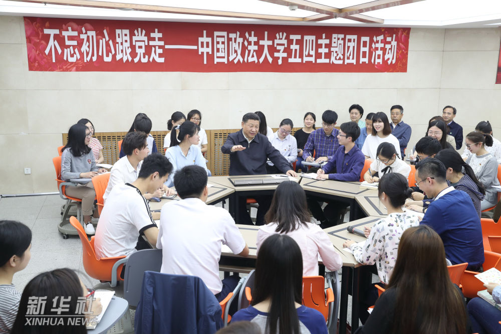 ↑2017年5月3日,习近平来到中国政法大学考察。这是习近平在学生活动中心参加民商经济法学院本科二年级2班团支部开展的“不忘初心跟党走”主题团日活动。