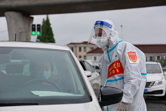 “您好,请出示通行证和核酸检测报告。”5月13日上午,第二天就要退休的书院派出所社区民警陈永官,穿着严密的防护服,依旧在临港大道上设卡检查着过往车辆和人员。按照要求严格检查完毕之后,他还不忘提醒对方注意防护,如果有需要,他还会当场送点干粮给过往的货车司机。