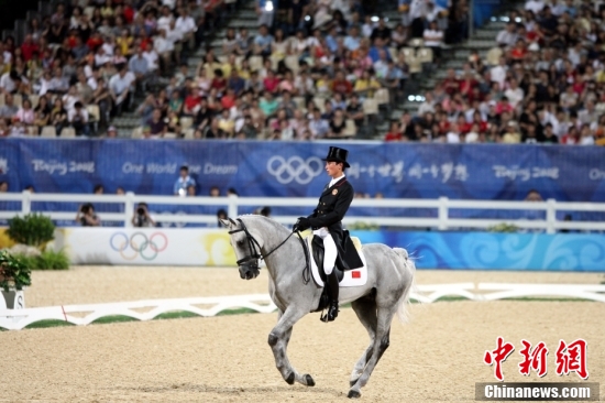 2008年8月9日晚,在香港沙田奥运马术赛场上,三项赛的盛装舞步夜间赛事开赛。首位参加奥运马术比赛的中国选手华天轻驾爱驹,优雅登场,香港观众怡然欣赏了这场马的芭蕾表演。中新社记者 洪少葵 摄