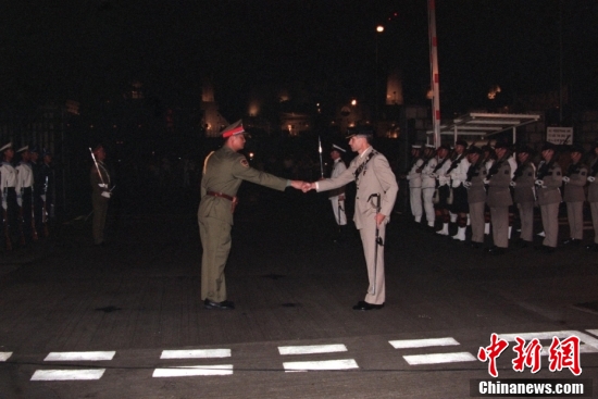 1997年7月1日,中国人民解放军驻港先头部队在添马舰英军司令部威尔斯亲王军营与英军交接防务。中新社发 陈德 摄