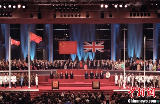 1997年7月1日零点,在雄壮的中华人民共和国国歌声中,中华人民共和国国旗和香港特别行政区区旗冉冉升起。中新社发 李刚 摄