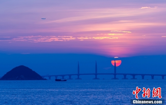 2018年10月22日早晨,港珠澳大桥开通前一天,从广东珠海的情侣路向东眺望,一轮红日从东方冉冉升起,将港珠澳大桥映射得格外迷人。中新社记者 张炜 摄