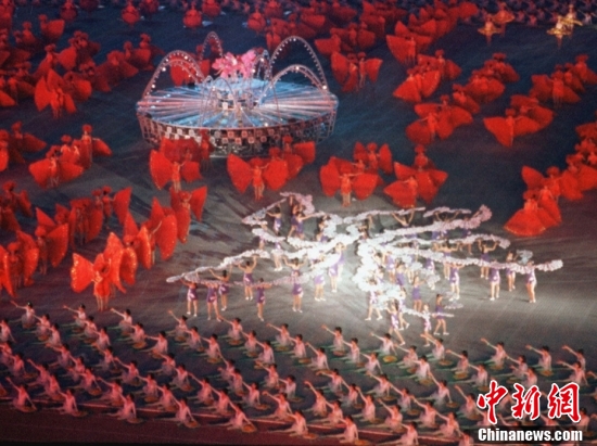 1997年10月12日,中华人民共和国第八届运动会开幕式团体操中表现香港回归的“紫荆回归”,香港特别行政区体育代表团首次参加全运会。中新社发 章黎节 摄