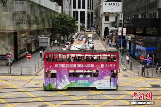 2022年6月21日,一辆车身贴有庆祝香港回归25周年的电车经过中环街头。中新社记者 张炜 摄
