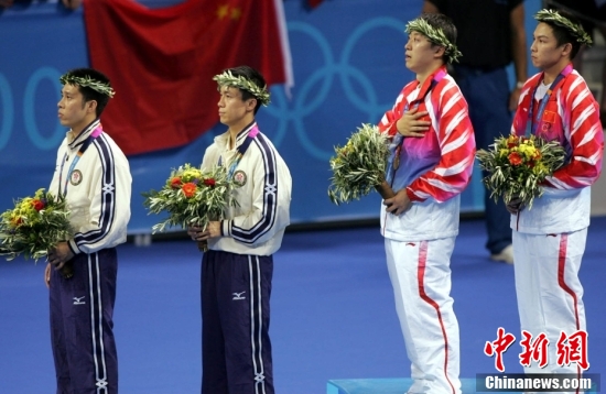 2004年8月21日,中国乒乓球选手马琳、陈玘和中国香港选手李静、高礼泽一同登上雅典奥运会颁奖台。中新社发 任晨鸣 摄
