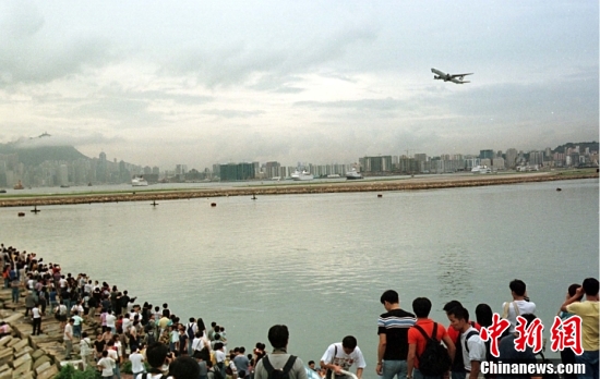 1998年7月,香港国际机场即将投入使用,市民告别启德机场在官塘堤上争相留下飞机起落的镜头。中新社发 杨佐桓 摄