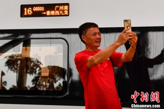 2018年9月23日,广深港高铁全线开通运营,从广州前往香港的G6501次高铁列车停靠在广州南站站台上。乘客正在拍照留念。中新社记者 陈骥旻 摄