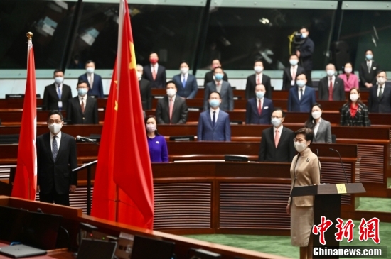 2022年1月3日,香港特区第七届立法会议员宣誓仪式在立法会综合大楼会议厅进行,监誓人特区行政长官林郑月娥确定全体90位候任立法会议员的宣誓为有效宣誓。图为林郑月娥与议员面向国旗及区旗唱国歌。中新社记者 李志华 摄