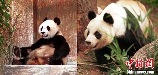 1999年5月,由中央政府赠送予香港特区的一对珍贵大熊猫——安安(右)与佳佳(左),在新开放的海洋公园内舒适的生活。中新社发 洪少葵 摄