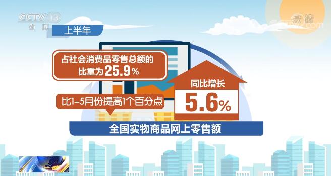 促消费政策持续发力,民生消费物流需求实现较快增长。上半年,全国实物商品网上零售额同比增长5.6%,占社会消费品零售总额的比重为25.9%,比1—5月份提高1个百分点。